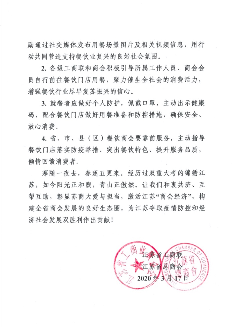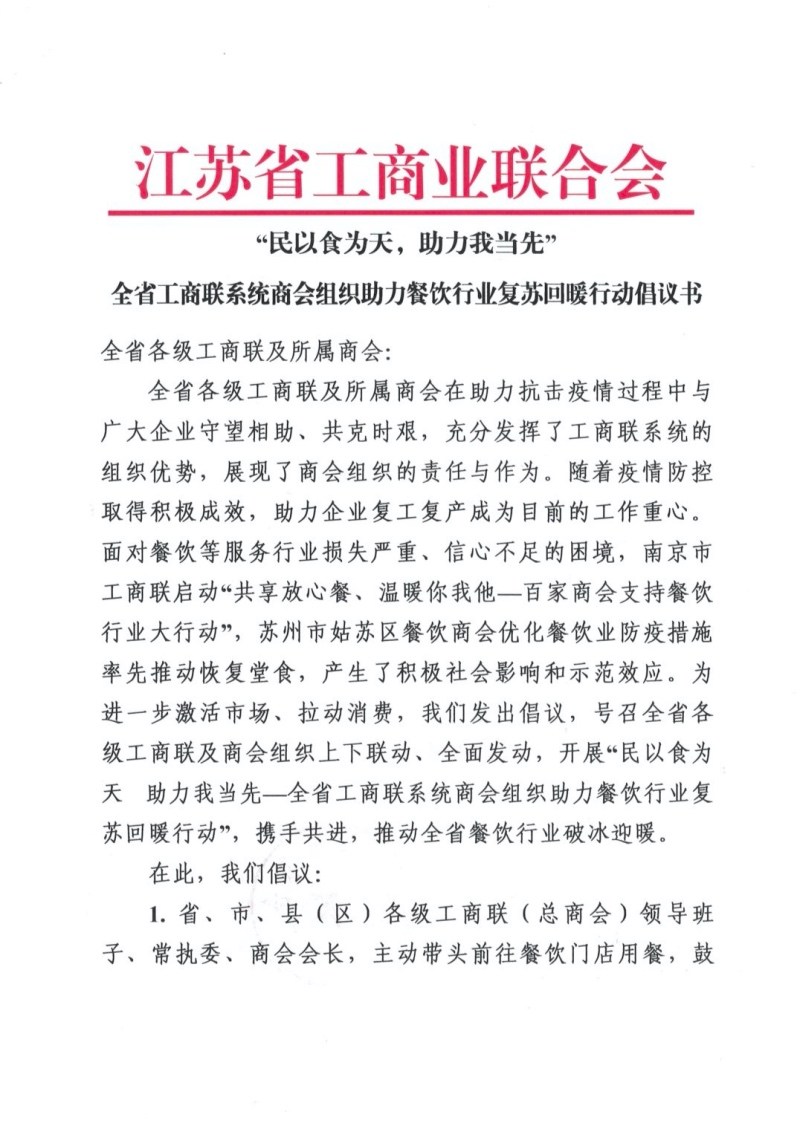 江苏省工商联系统商会组织助力餐饮行业复苏回暖行动倡议书