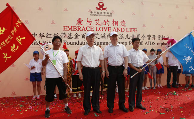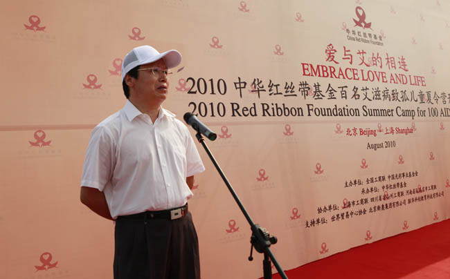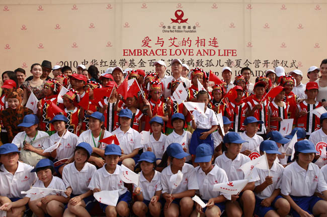 8月8日,由全国工商联和中国光彩事业基金会共同主办,中华红丝带基金承办,主题为“爱与艾的相连”——2010中华红丝带夏令营活动在奥运鸟巢前开营。全国政协副主席、全国工商联主席、中华红丝带基金名誉理事长黄孟复,国务院防治艾滋病工作委员会办公室主任、卫生部副部长尹力,全国工商联副主席、中华红丝带基金理事长谢经荣,全国工商联副主席、基金执行理事长、世茂集团董事局主席许荣茂,中华慈善总会副会长、中华红丝带基金副理事长彭玉,全国工商联秘书长、中华红丝带基金副监事长谷彦芬,北京市工商联党组书记、第一副主席吴杰,国际著名影星章子怡,奥运冠军钱红、田亮,基金凉山州项目关爱大使沙玛阿果、吉杰,联合国艾滋病规划署中国亲善大使、中央电视台著名节目主持人周柳建成,以及中华红丝带基金理事会员、部分在京全国工商联直属行业商会负责人等社会各界爱心人士近300人出席了此次活动。此次共邀请了来自河南上蔡、四川凉山共100名艾滋病致孤孤儿参加在北京、上海举行的为期5天的夏令营活动。