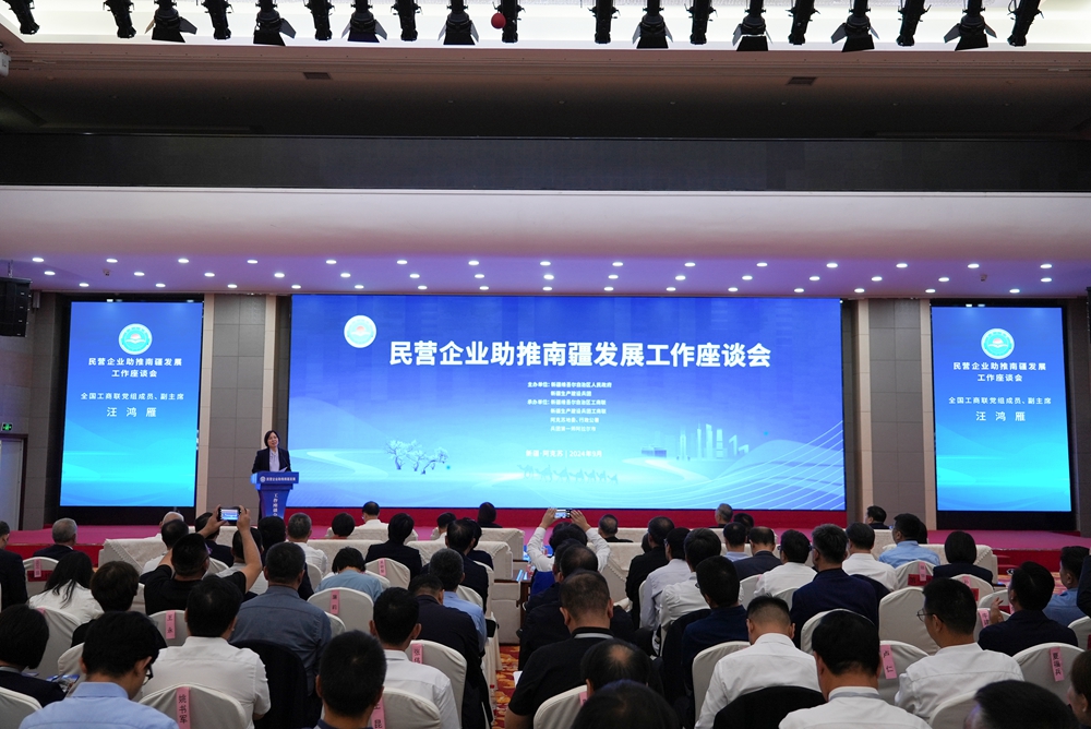 9月27日上午,民营企业助推南疆发展工作座谈会在阿克苏召开。会议由新疆维吾尔自治区人民政府、新疆生产建设兵团主办。全国工商联党组成员、副主席汪鸿雁,新疆维吾尔自治区政府副主席凯赛尔·阿不都克热木出席会议并讲话。自治区政协副主席、自治区工商联主席刘会军主持会议。