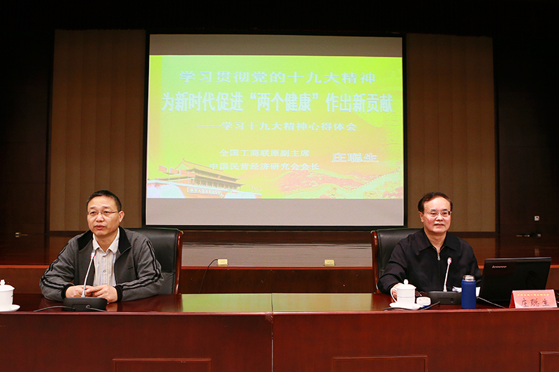 庄聪生同志从深刻把握十九大报告重要论述,深刻把握十九大关于支持民营经济发展的重要论述,正确认识新时代民营经济发展面临的市场八大变化三个方面对党的十九大报告进行了详细解读,尤其对报告中鼓励支持民营经济发展作出的重大论述进行了深刻诠释。他说,党的十九大提出了新时代、新思想、新战略、新阶段、新作为,就鼓励支持民营经济发展作出许多新的重大论述,为我国民营经济持续健康发展指明了方向,标志着我国民营经济将迎来新的历史机遇和进入一个新的发展阶段。他着重从十九大报告再次重申坚持“两个毫不动摇”、第一次提出要支持民营企业发展、强调把发展经济的着力点放在实体经济上来、提出要打破行政性垄断、清理废除妨碍统一市场和公平竞争的各种规定和做法、第一次提出要加强对中小企业创新支持、提出支持传统产业优化升级、提出经济体制改革必须以完善产权制度和要素市场化配置为重点、提出进一步激发和保护企业家精神、提出要构建亲清新型政商关系等九个方面进行了深入分析。最后,他结合国内外形势变化就正确认识新时代民营经济发展面临的变化进行了讲解,提出由于我国经济发展进入新常态面临着年代变了、消费观念变了、企业发展途径变了等变化,民营企业家的思想观念、生产方式、商业模式也要紧跟时代发展变化的趋势,坚持走创新驱动的发展之路,在新时代为全面决胜小康社会、实现中华民族伟大复兴中国梦作出新贡献。