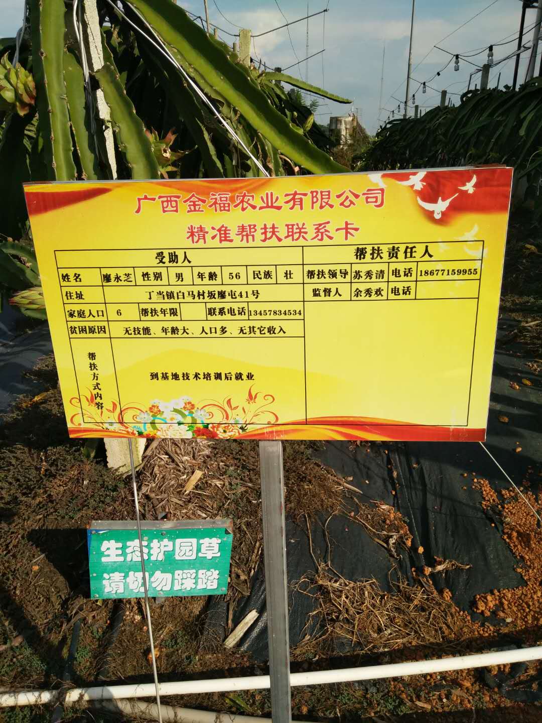金福的火龙果“火”起来了,同时也带火了周边村民的日子。在金福种植基地,一张张贫困户信息牌特别引人注目,牌上标有该贫困户的家庭情况、工种、月收入及公司给予的帮扶内容等信息。
