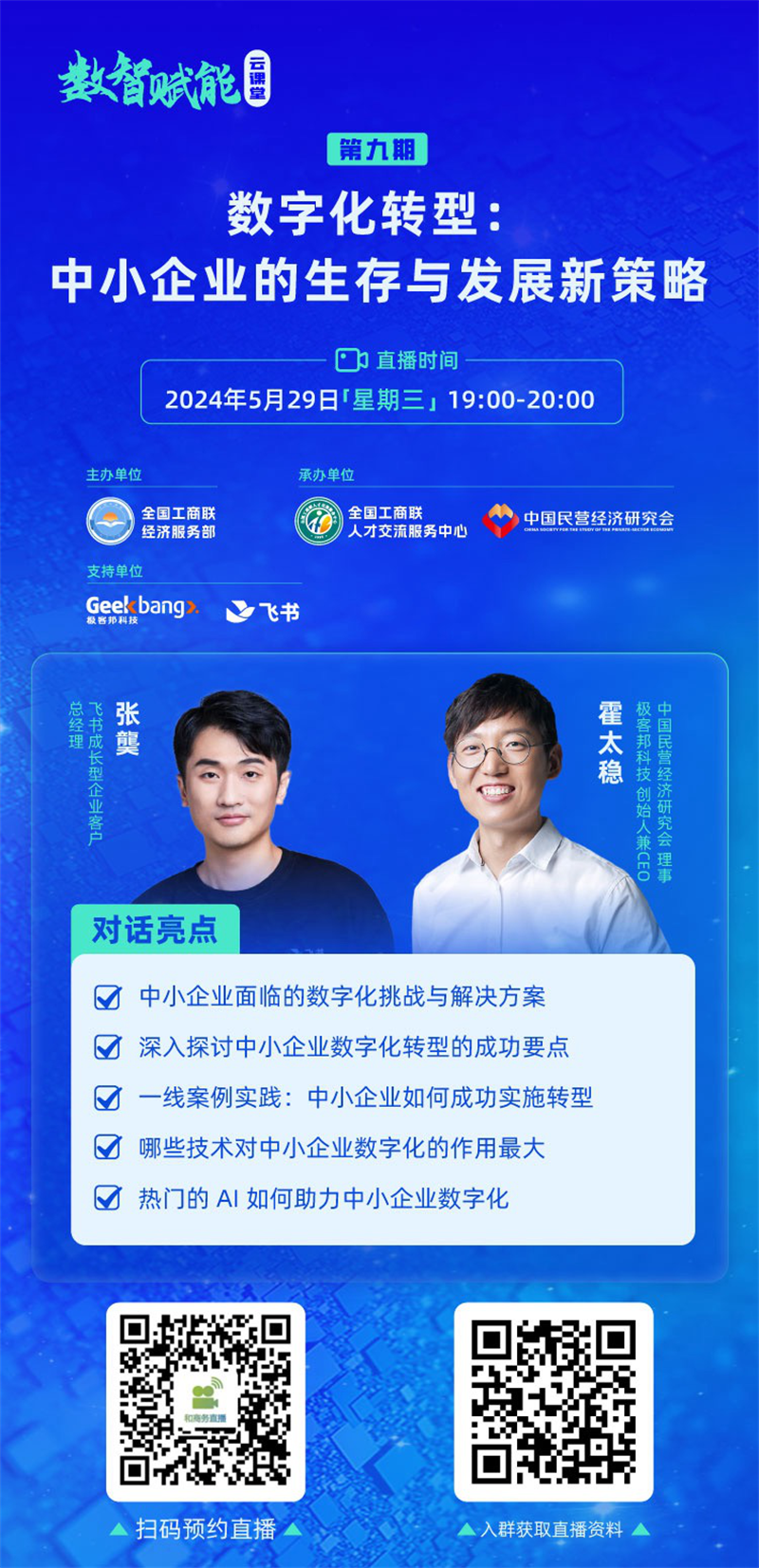 为了进一步探讨上述话题,5月29日19:00-20:00,第9期“数智赋能云课堂”,将围绕“关于中小企业如何在数字化转型中寻找到生存与发展新策略”,邀请中国民营经济研究会理事、极客邦科技创始人兼CEO霍太稳,以及飞书成长型企业客户总经理张龑进行深入对话。他们将分享宝贵的见解和实践经验,讨论数字化转型对于中小企业生存与发展的重要性,以及如何通过实施合适的策略来克服转型过程中遇到的挑战。