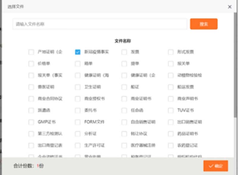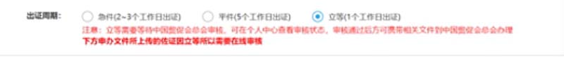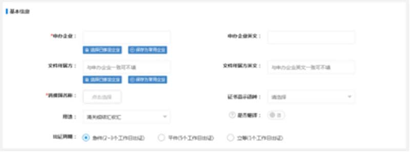 基本信息栏主要是显示申办方,文件所属方等信息,其中申办企业和消费国为必填项。填写申办企业时需是用户所绑定的企业,如果之前没有绑定,则可以输入企业全称,点击“保存为常用企业”在本页面进行绑定。(如为本公司自行申办文件所属方不用填写)出证周期选择“立等”;点击“添加文件”选择新冠疫情事实性证明;认证类型选择新型冠状病毒疫情事实证明书,按要求上传佐证材料(PDF格式)。