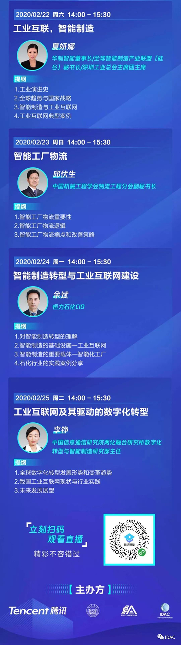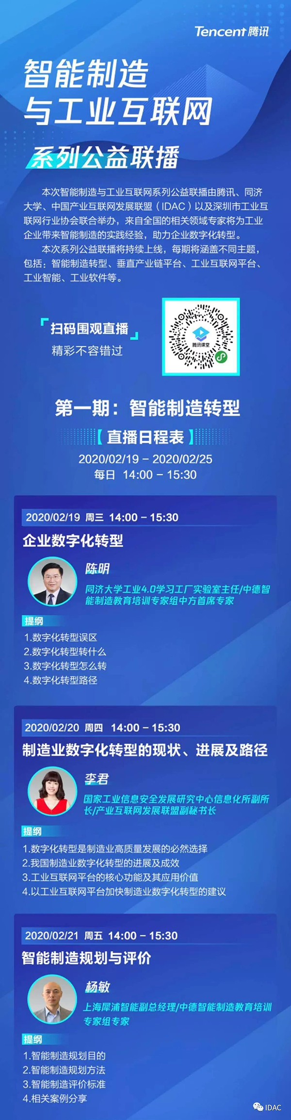 2月19日,为了助力制造业复工复产和数字化升级,中国产业互联网发展联盟(IDAC)联合腾讯、同济大学、深圳市工业互联网行业协会举办的《智能制造与工业互联网系列公益联播》直播第一期正式上线,用户可通过腾讯课堂小程序、网页端、PC客户端、手机APP端进行观看。这一公益直播基于制造业面临的痛点,邀请相关领域专家从智能制造转型、垂直产业链平台、工业互联网平台、工业智能、工业软件等多个专题解读数字化转型之路,让有需求的制造企业,第一时间了解行业发展态势以及当下最新技术和实践案例。线上公益直播未来将持续30-40天,汇集行业领域知名专家,面向全国工业企业进行知识及经验分享,从0到1为制造业数字化建设支招,帮助企业复工复产。