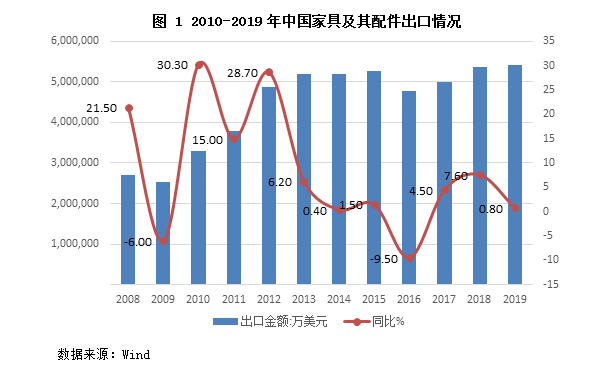 自加入世贸组织以来,我国家具出口一直保持增长态势。我国是世界上最大的家具生产和出口国,在全球家具出口贸易中占有重要地位。在经历了2008年金融危机的短暂疲软后,家具出口一度保持了6年的连续增长。受劳动力、原材料、物流和环保成本上涨等众多不利因素的影响,2016年中国家具出口额出现大幅下滑,2017年实现缓慢回升,2018年出口同比增长7.6%,2019年同比继续增长0.8%,出口额达到541亿美元。