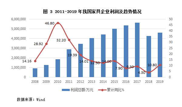 2019年家具行业规模以上企业利润有所增长。根据wind数据,截至2019年底,我国家具行业规模以上企业6410家,主要集中在广东、浙江、福建等地。2019年全年,家具行业规模以上企业累计完成营业收入7117.16亿元,同比增长1.48%;累计利润总额462.73亿元,同比增长10.8%。