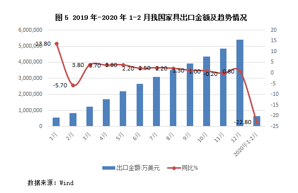海外疫情肆虐,由需求端引发家具出口“寒潮”。我国是家具生产和出口大国,出口是相当一部分家具企业的重要收入来源。据Wind数据统计,2019年全国家具及零配件出口542.26亿美元,其中1-2月出口82.25亿美元,占全年的15.17%。2020年1-2月,受疫情影响,家具及零配件出口63.49亿美元,比去年同期下降22.8%,对出口影响非常明显。