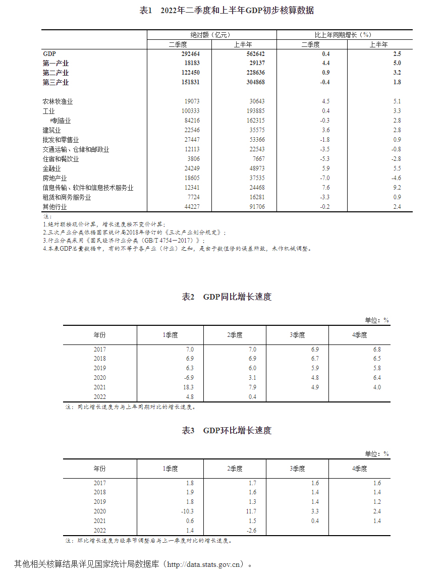 根据有关基础资料和国内生产总值(GDP)核算方法,经初步核算,我国2022年二季度和上半年 GDP核算结果如下。