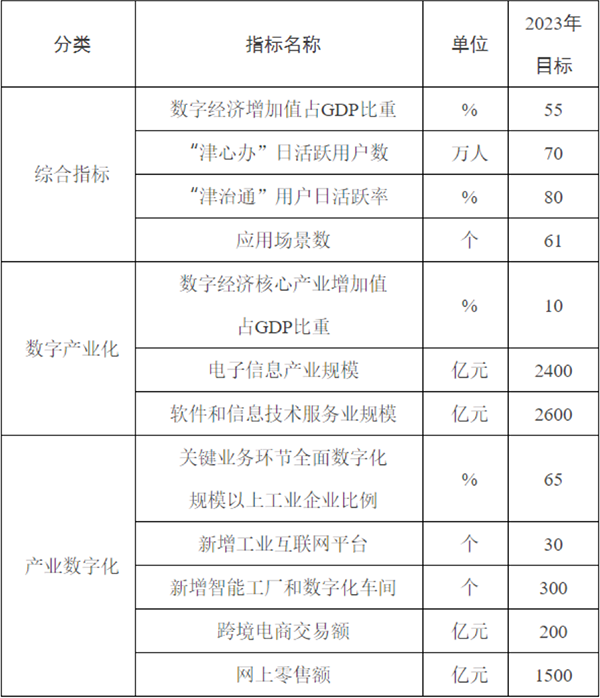 ——数字经济。建成“津产发”数字经济综合应用平台,健全以制造业、商贸业、现代服务业转型升级为重点的数字经济“1+3”政策体系,到2023年数字经济增加值占地区生产总值(GDP)比重不低于55%。重点领域智能制造水平显著提升,以数据为关键要素的新产品、新模式、新业态、新场景蓬勃发展,力争成为国内领先的新一代信息技术与制造业深度融合示范区,新兴数字产业和制造业数字化水平位居全国前列,成为国家智能科技产业北方基地,抢占世界智能科技产业制高点。
