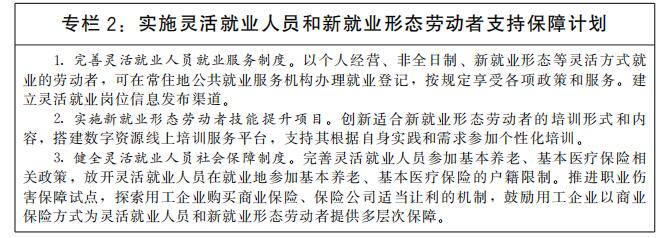支持多渠道灵活就业和新就业形态发展。破除各种不合理限制,建立促进多渠道灵活就业机制,支持和规范发展新就业形态。鼓励传统行业跨界融合、业态创新,增加灵活就业和新就业形态就业机会。加快落实《关于维护新就业形态劳动者劳动保障权益的指导意见》,建立完善适应灵活就业和新就业形态的劳动权益保障制度,引导支持灵活就业人员和新就业形态劳动者参加社会保险,提高灵活就业人员和新就业形态劳动者社会保障水平。规范平台企业用工,明确平台企业劳动保护责任。健全职业分类动态调整机制,持续开发新职业,发布新职业标准。