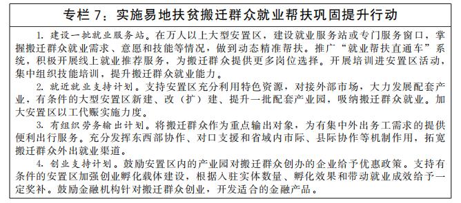稳定脱贫人口就业。健全脱贫人口、农村低收入人口就业帮扶长效机制,保持脱贫人口就业领域的扶持政策、资金支持、帮扶力量总体稳定。健全有组织劳务输出工作机制,将脱贫人口作为优先保障对象,稳定外出务工规模。支持脱贫地区大力发展当地优势特色产业,继续发挥就业帮扶车间、社区工厂、卫星工厂等就业载体作用,为脱贫人口创造就地就近就业机会。聚焦国家乡村振兴重点帮扶县、易地扶贫搬迁安置区,积极引进适合当地群众就业需求的劳动密集型、生态友好型企业(项目),增加本地就业岗位,组织专项就业服务活动实施集中帮扶。