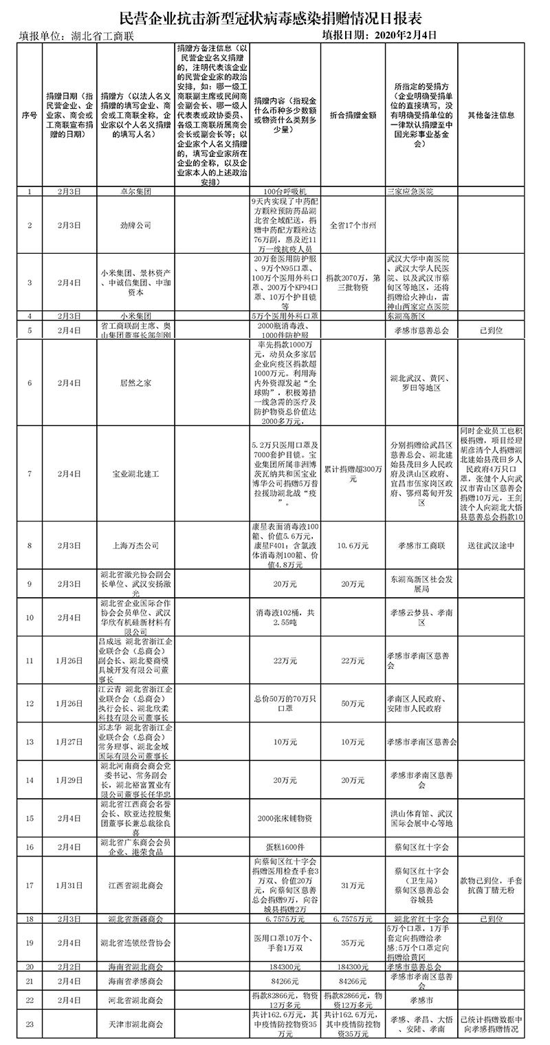 疫情就是命令,防控就是责任,驰援一刻不停。在疫情防控的关键时刻,湖北民营企业众志成城、担当责任,奉献爱心、接续力量,积极参与湖北疫情防控工作,捐款捐物持续进行中(详细捐赠情况见附表):