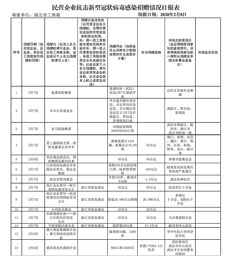 截至2月8日17:00,根据省工商联初步统计,楚商及部分省外企业累计捐赠:现金人民币65836.32万元,折价医疗物资价值64777.09万元,未折价医疗物资:医用外科口罩6435672只,民用口罩43.3万只,KF口罩720只,N95口罩5箱,N95口套30840只,隔离服2200件,防化服650箱,防护服19.89万件,医用手套17.65万双,手套26万副,护目镜6.155万只,卫生帽5万个,静电空气净化机200台,呼吸机100台,消毒机10台,消毒水1车,消毒物资235.3吨,漂白水20万瓶,洗手液20.1万瓶,消毒液780箱,20桶消毒液,84消毒液1桶,84消毒液8500瓶,消毒液2000瓶,制氧机40套,测温仪550套,体温检测枪24支,电子体温计3000支;泰康同济(武汉)医院(筹)提供800个床位,卓尔6家慈善、应急性防疫医院保障3727个专用床位;欧亚达为武汉“方舱医院”提供2000张床铺物资;620件羽绒服,食品和饮品2500余箱,蛋糕3924箱;全省医护人员每人20万元保额的保险;卓尔控股利用自身跨境供应链资源采购医用口罩320万个,防护服21万件,通过武汉市红十字会捐赠给急需的医疗机构。
