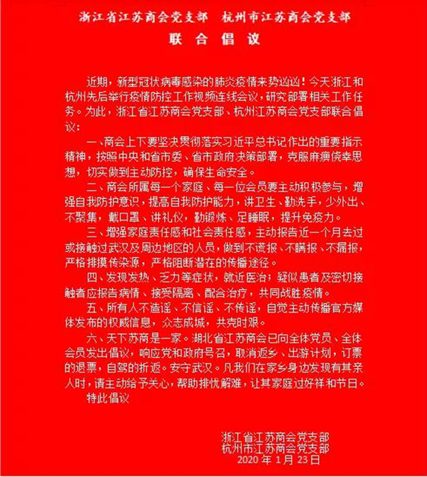 浙江省江苏商会“八个一”务实举措抗疫情
