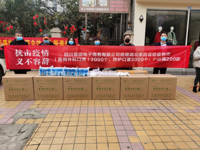 易田公司捐赠总价值人民币18万元的医疗防护及生活物资(医用外科口罩、防护口罩、护目镜等),专项用于湖北省孝昌市、石柱县、潼南区、柏梓镇、阿坝县等地抗击疫情救援防护工作。