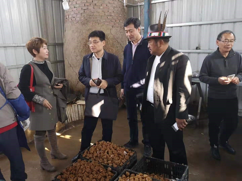 12月10日,第二小组走访巧家县金塘镇梨树村扶贫产业基地。丽江正龙集团董事长杨四龙(右二)与万华食品公司对接定制小碗红糖产品,用于正龙集团旅游板块纪念品销售。