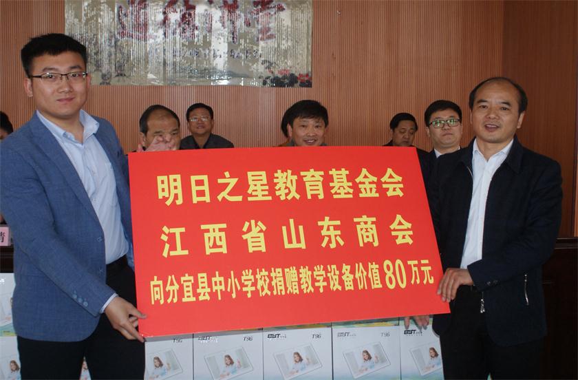 活动中,明日之星教育基金会、江西省山东商会向新余市捐赠价值280万元物资。其中,向分宜县捐赠价值80万元的信息化教学设备,覆盖全县32所城乡中小学校。