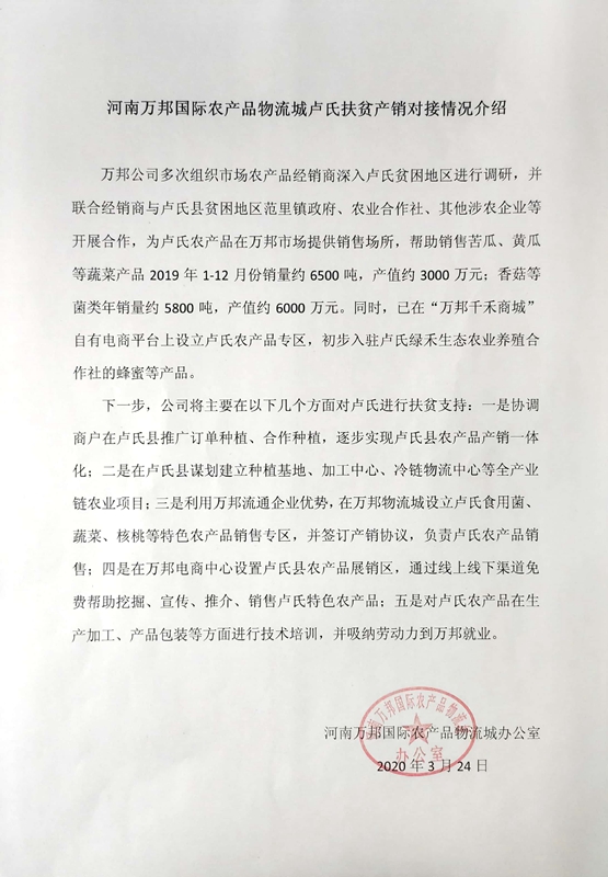 河南万邦国际农产品物流城卢氏扶贫产销对接情况介绍