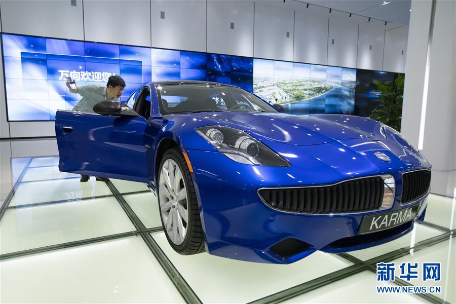 2018年7月4日,一名参观者在观看万向集团旗下公司研发的、在北美地区上市的KARMA混动跑车。