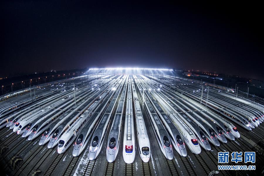 2月1日,动车组停靠在武汉动车段的存车线上,准备进行检修和保温作业。新华社记者 肖艺九 摄