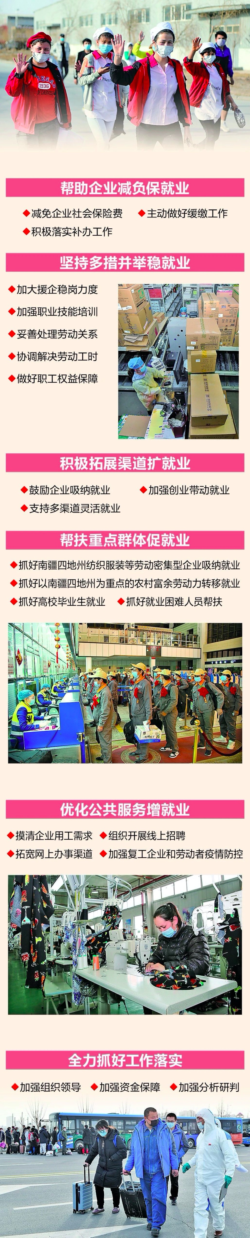 (十三)抓好以南疆四地州为重点的农村富余劳动力转移就业。加大与内地援疆省市主动对接,南疆四地州安排专人对接,掌握内地及援疆省市企业用工需求,及时有序组织输送。疫情防控期间,按照输出有组织、健康有监测、到达有交接、承运有防护、全程有追溯的要求,通过“点对点”包车、“一站式”直达或联程运输等方式,有序组织农村富余劳动力整建制转移就业。积极开展“春风行动”,帮助农村富余劳动力就地就近转移就业。持续跟进落实社会保险补贴等各项就业扶持政策,最大限度稳住现有已转移就业的南疆四地州建档立卡贫困家庭劳动力就业岗位。加大就业扶贫,对新转移就业的优先安排建档立卡家庭劳动力。