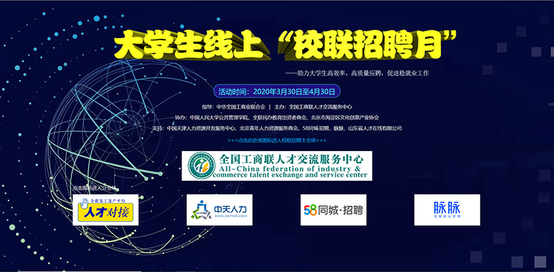 根据全国工商联关于引导民营企业积极吸纳大学生就业的部署要求,结合2020年全国工商联民营企业招聘周活动,为助力疫情期间大学生高质量就业,解决企业复工复产人才紧缺问题,在全国工商联机关会员部、扶贫部、人事部、信息中心大力支持下,由全国工商联人才交流服务中心主办,中国人民大学公共管理学院、全联民办教育出资者商会、北京市海淀区文化创意产业协会、中国天津人力资源开发服务中心、北京青年人力资源服务商会、58 同城•招聘、脉脉、山东省人才在线有限公司共同协办的大学生线上“校联招聘月”活动于2020年3月30日10时正式启动,活动时间为期一个月。